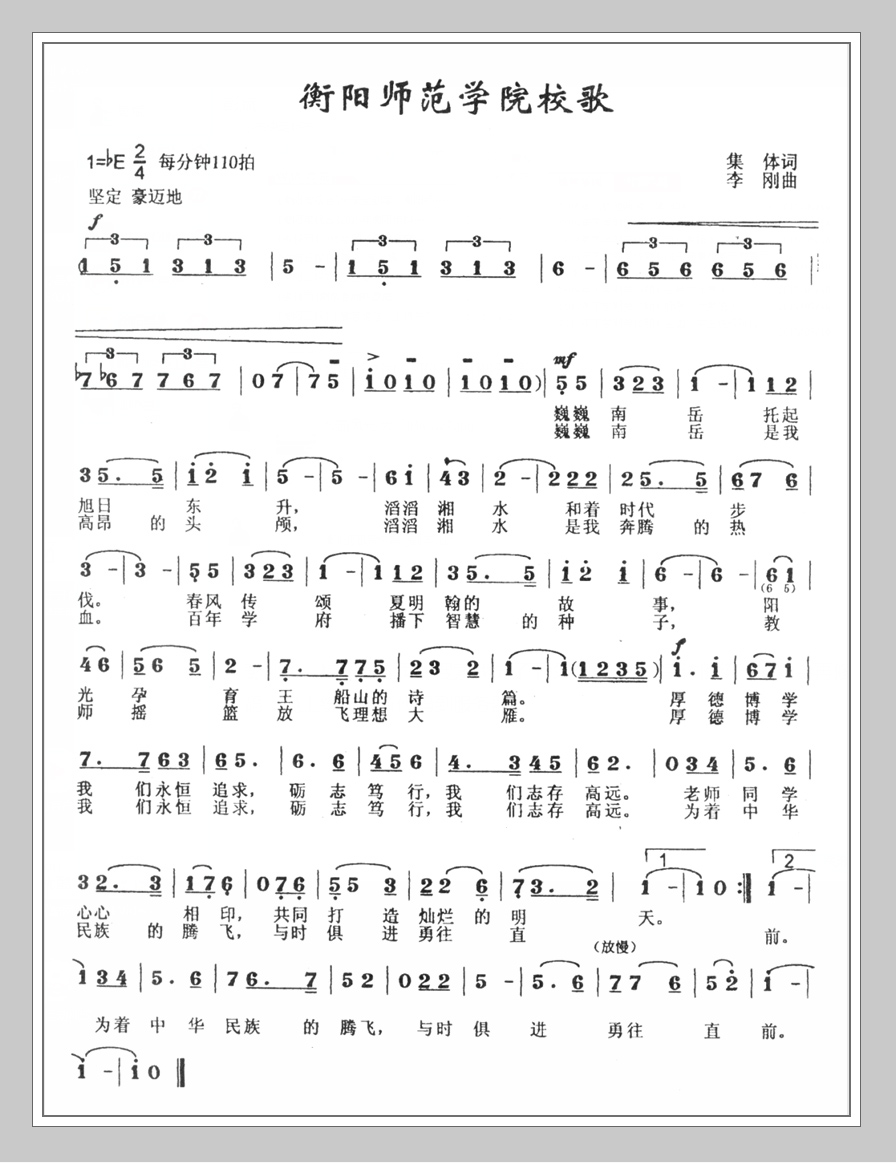 校歌歌曲为进行曲风格。全曲音乐分为两个部分。在激昂的前奏之后,第一部分热情而舒展,八度等大跳音程的运用,表现了南岳的雄伟和贝博官网师生良好的精神风貌;第二部分坚定有力的附点及切分节奏的运用讴歌了“校训”的精神,表现了师生面向美好未来的坚强决心。全曲昂扬向上,刚柔相济,旨在激励师生立志奋发,开创未来。